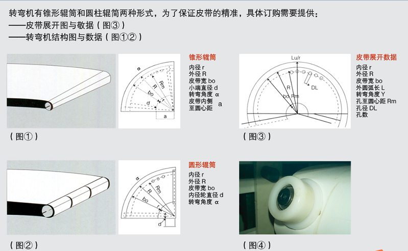 轉(zhuǎn)彎機(jī)有錐形輥筒和圓柱輥筒兩種形式,為了保證皮帶的精準(zhǔn),具體訂購需要提供: ——皮帶展開圖與敬據(jù) ——轉(zhuǎn)彎機(jī)結(jié)構(gòu)與數(shù)據(jù)
