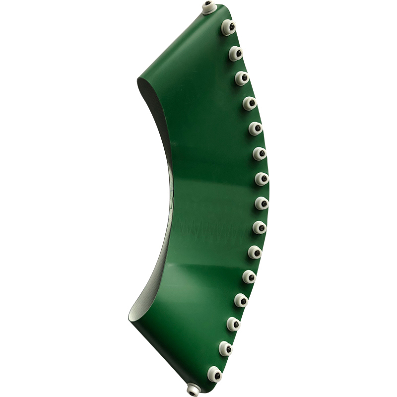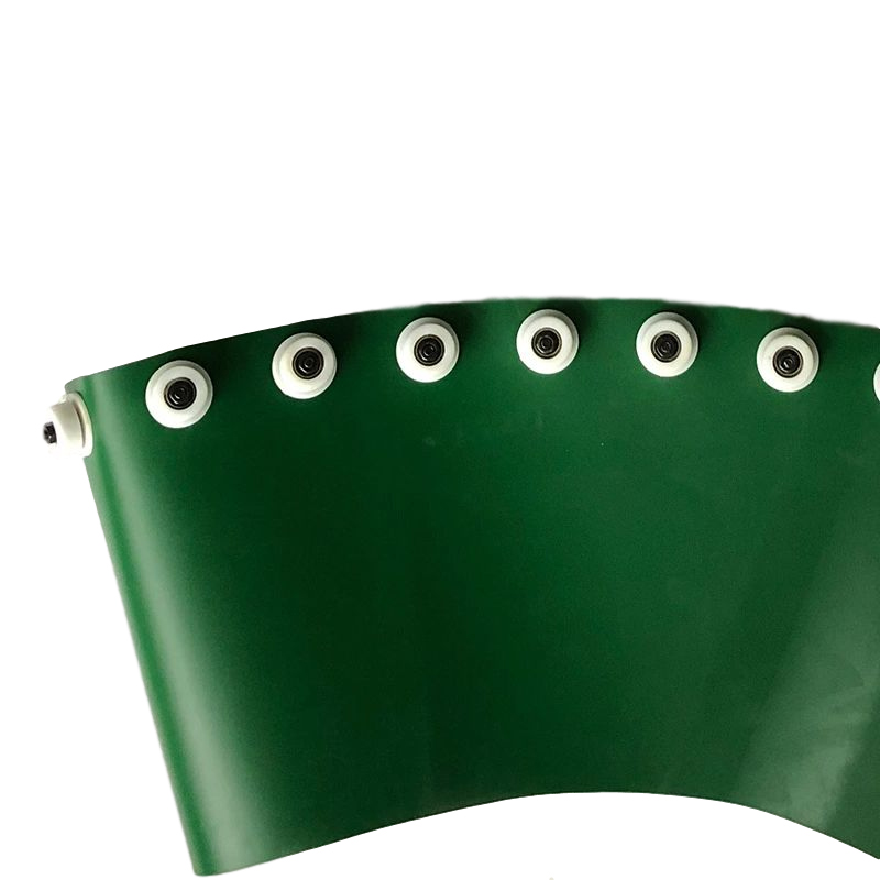 轉(zhuǎn)彎皮帶有兩種傳動方式: 1、將皮帶以圓帶、彈簧或金屬夾固定于鏈條上傳動。 2、用定位塑料導(dǎo)輪夾持皮帶。